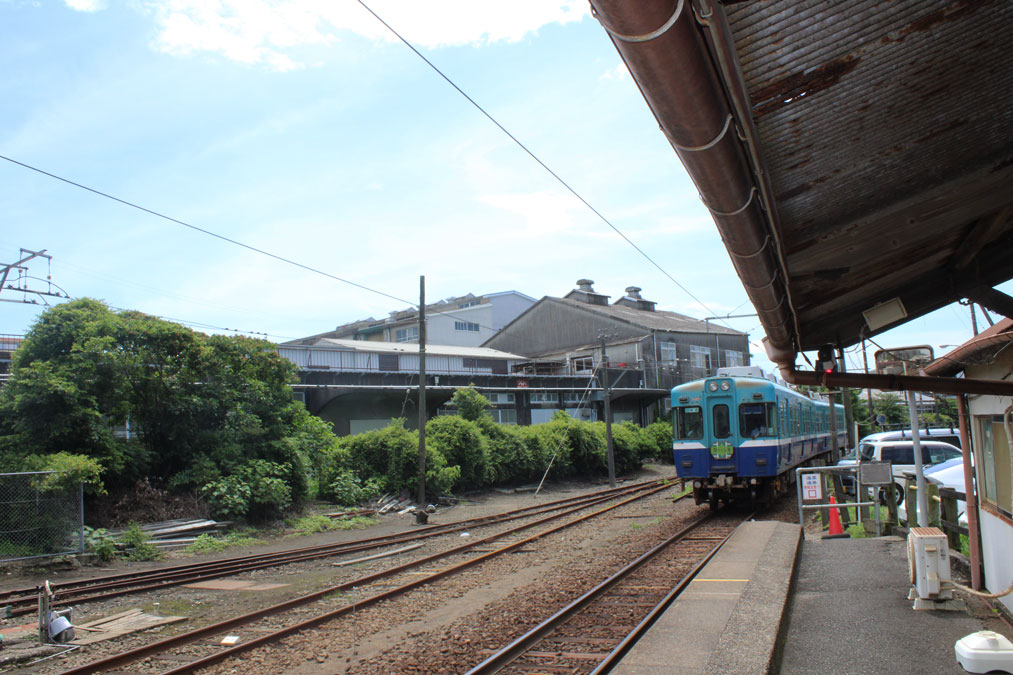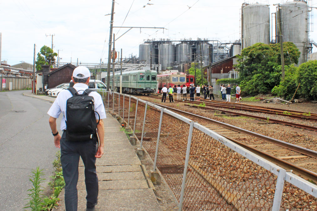 銚子電鉄の本社は銚子駅から徒歩10分、あ!電車が見えてきました!歩く速度が上がる院長。